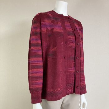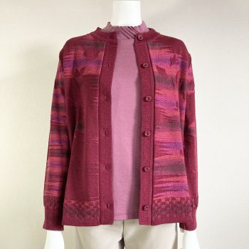 ・ワインのカーディガン×ローズピンクの無地カットソー