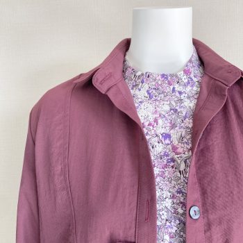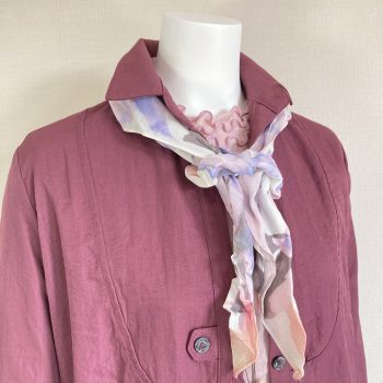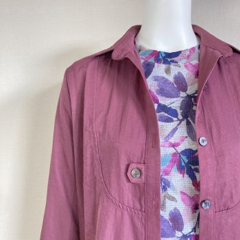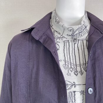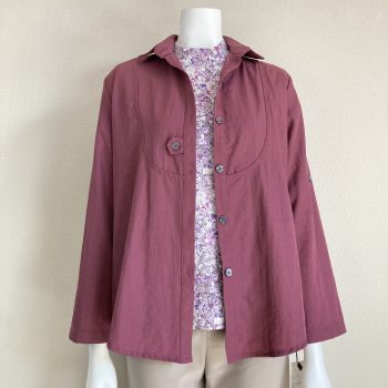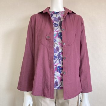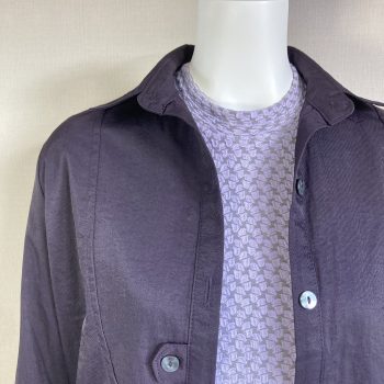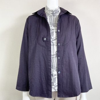 ・ダークパープルのジャケット×ラベンダーの細かい柄カットソー