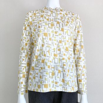 幾何学柄の優しい色合いのカットソーのピンクを、